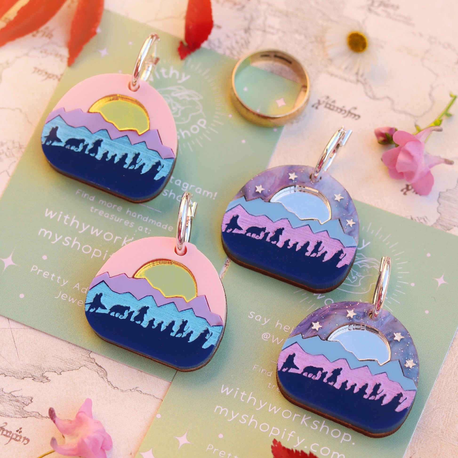 They feature shiny silver mirror acrylic and a glittery sky with characters sihouetted against hand-painted mountains.