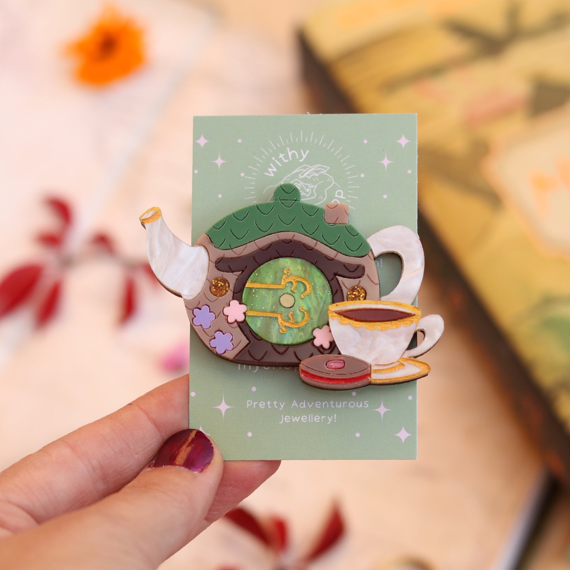 The Halfling Tea Time Brooch is made from laser-cut acrylics in shimmery marbled white, with a glittery grene door and painted and engraved details